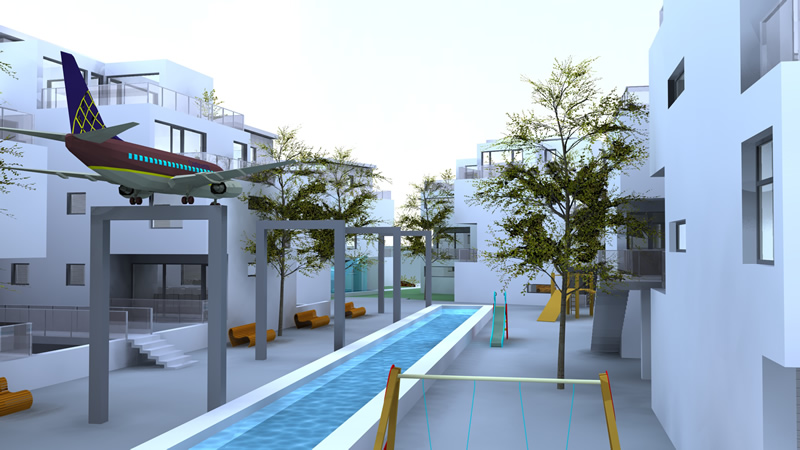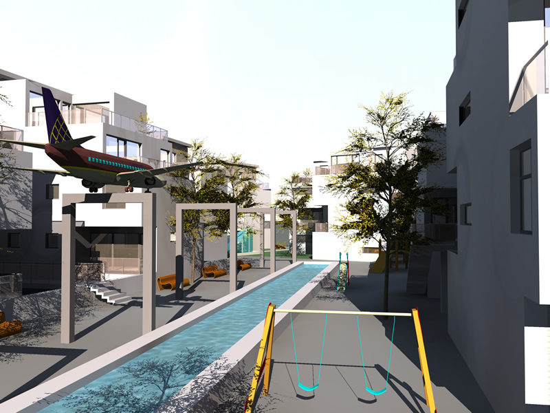 - There is a vertical connection between the underground services and the ground one, the last one will accomodate a suspended garden, kids playground and artesian well.